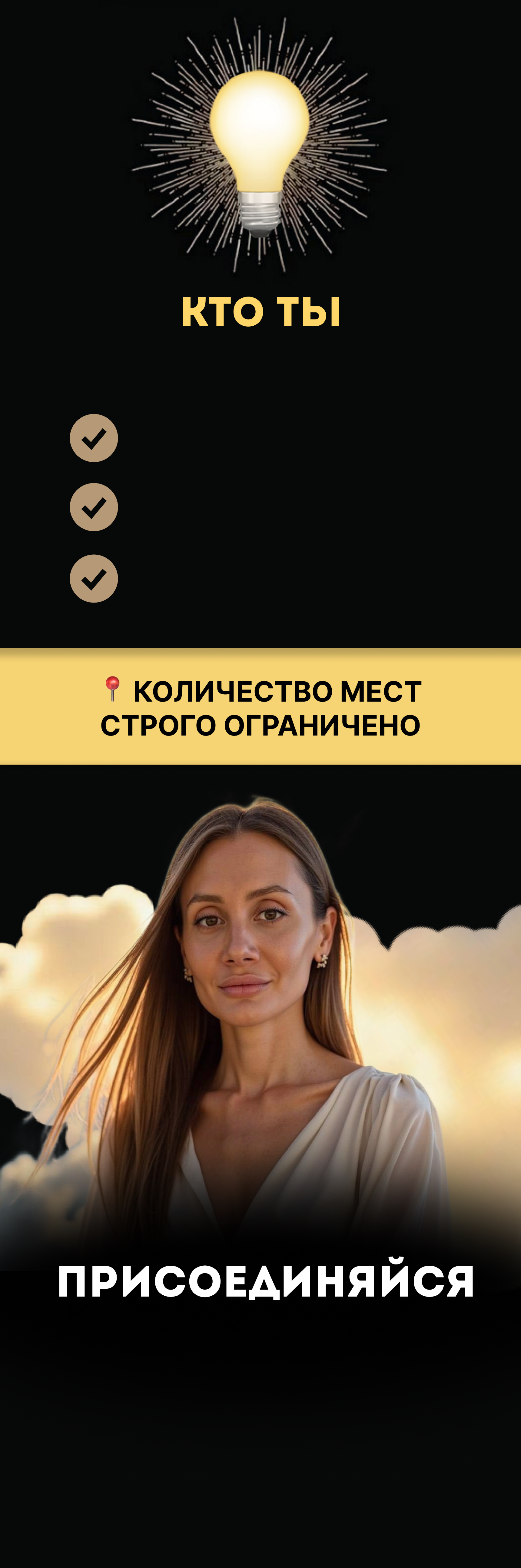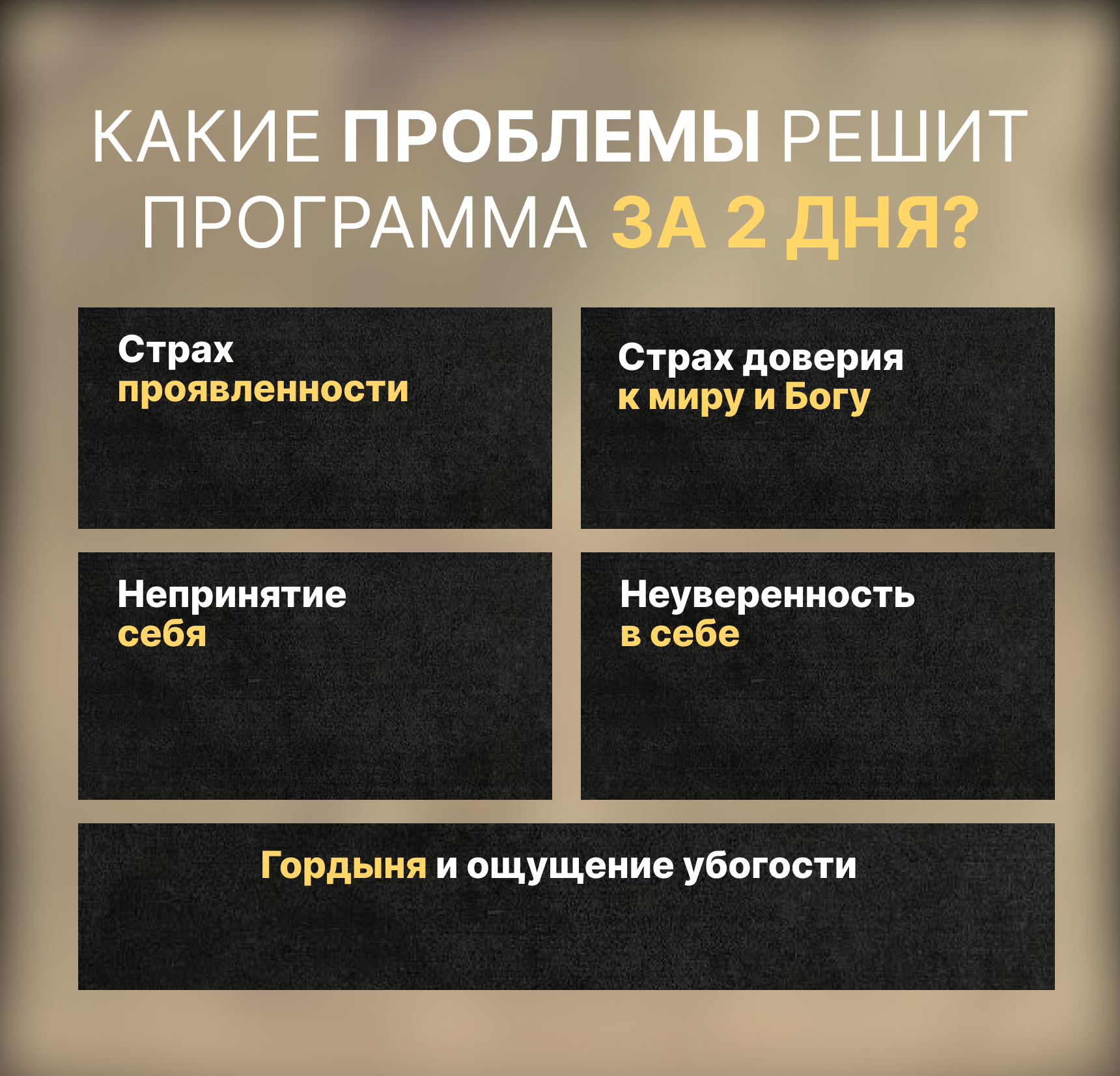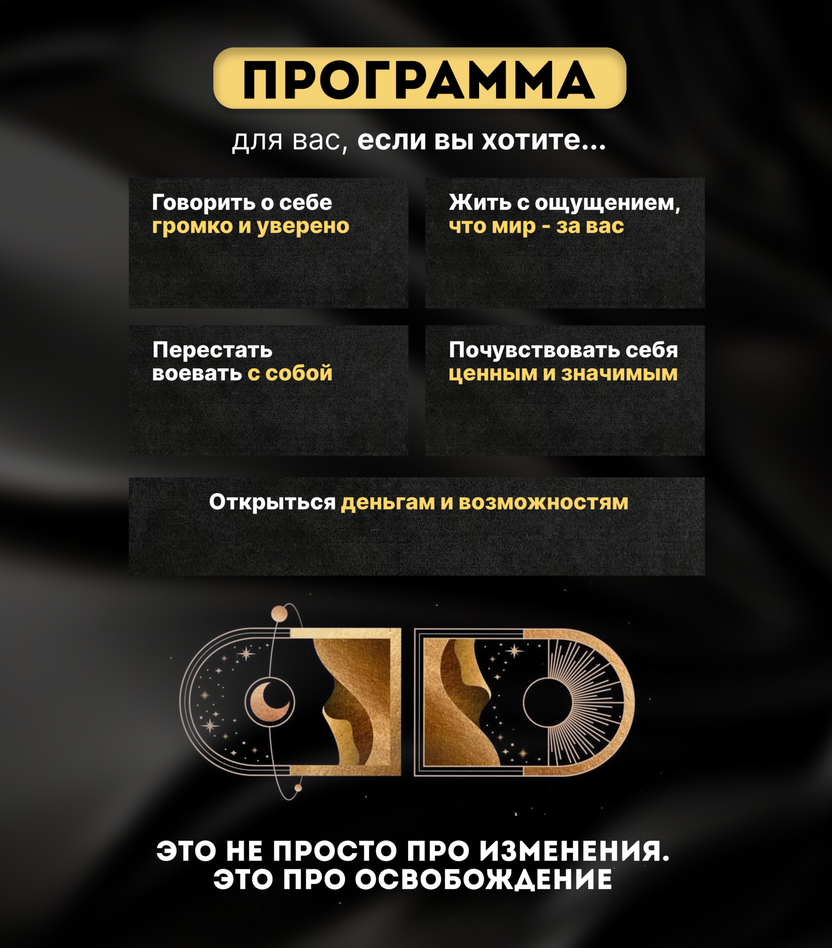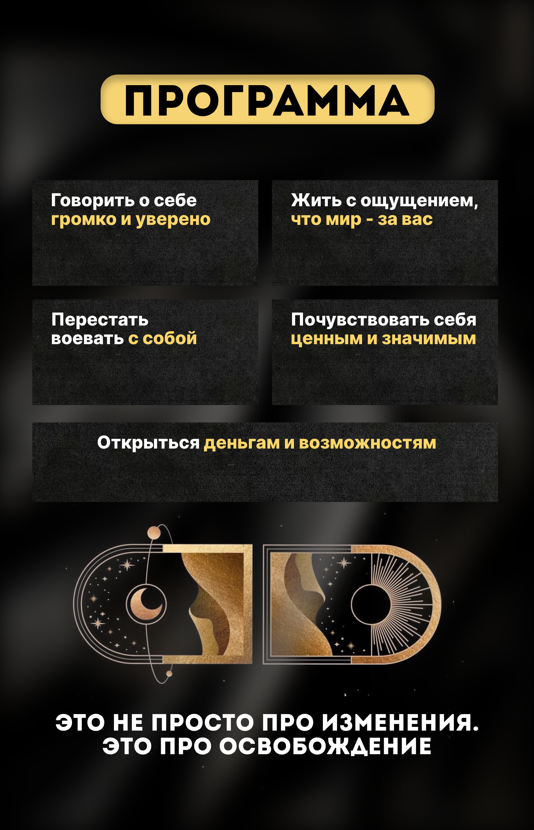 Ты увидишь, какая твоя теневая сторона мешает тебе принимать большие деньги, успех и возможности. Мы разберем, почему ты не позволяешь себе жить в своем масштабе.