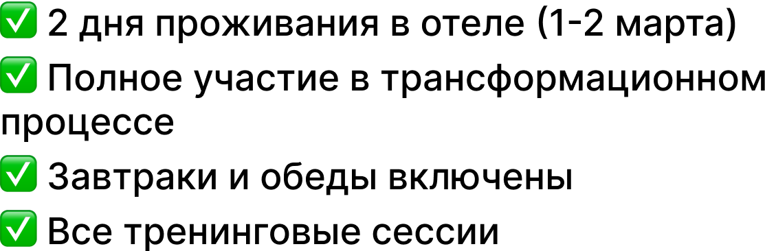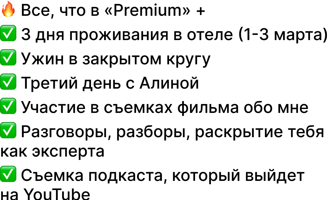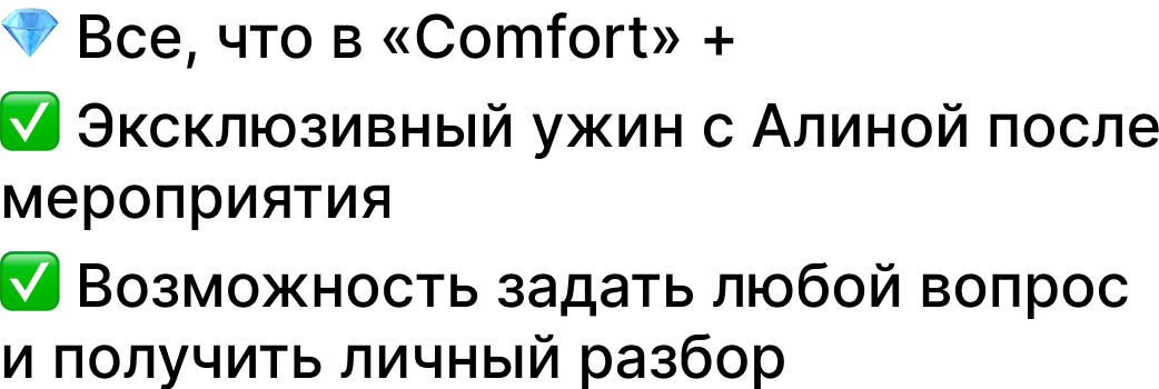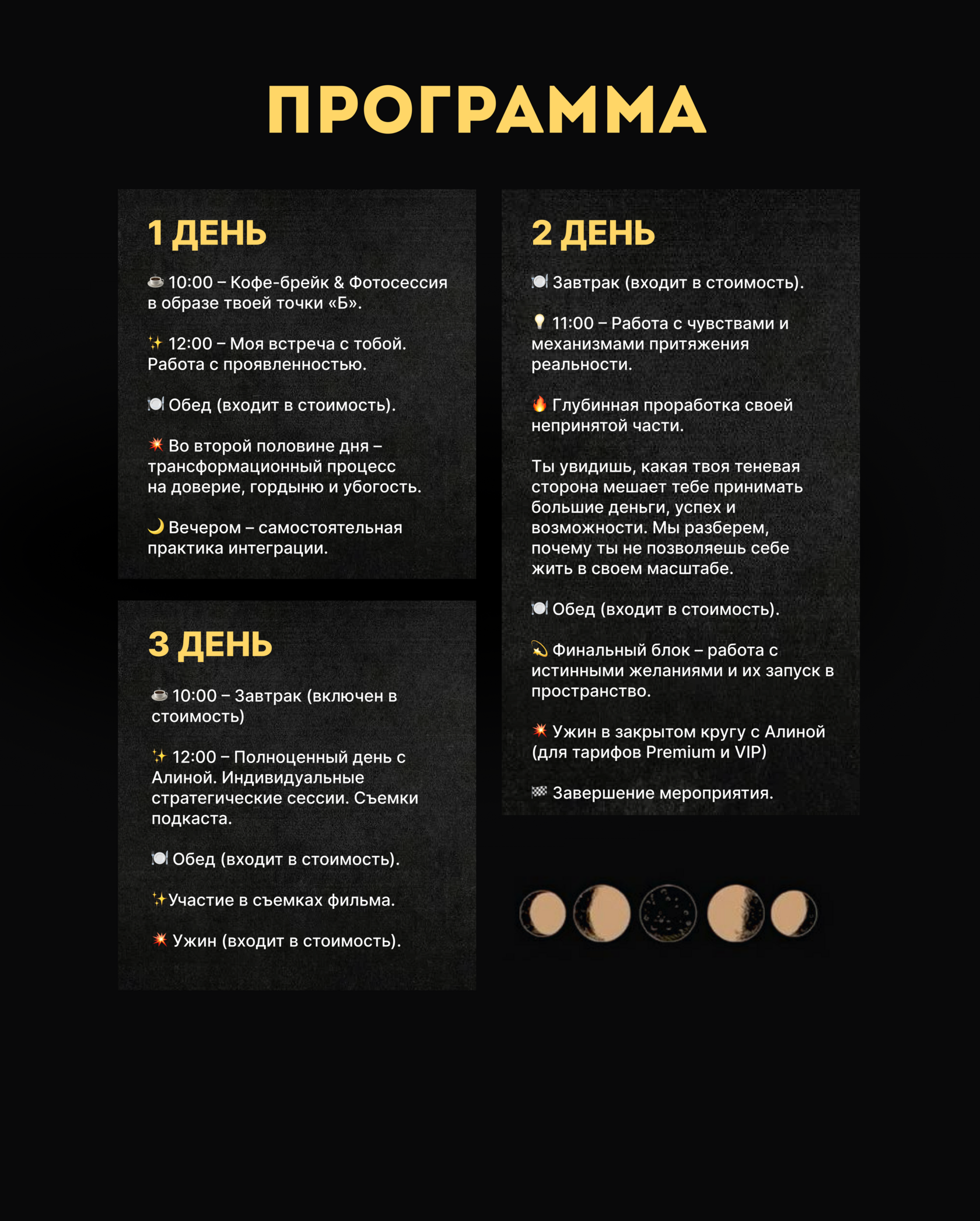 💫 Финальный блок – работа с истинными желаниями и их запуск в пространство. 💥 Ужин в закрытом кругу с Алиной (для тарифов Premium и VIP)