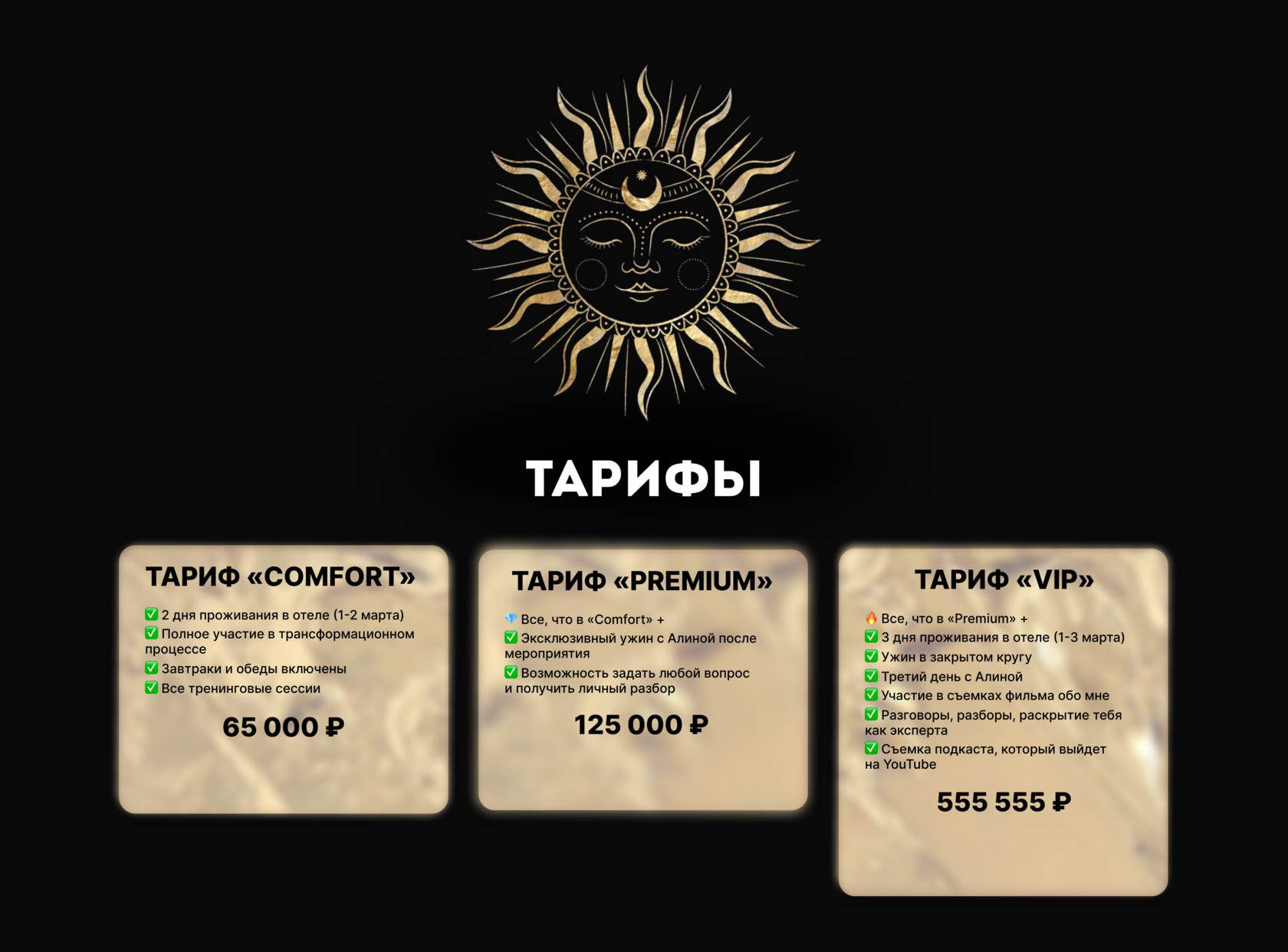 - в тарифе VIP включен ужин с Алиной в закрытом кругу, а также завтрак, обед и ужин в 3-й день